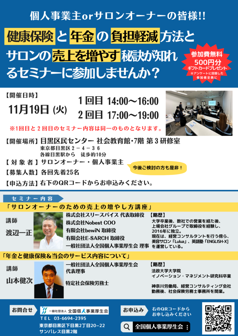 11月19日(火)目黒区民センター 社会教育館にてサロンオーナー、個人事業主の方向けの無料セミナーを […] -